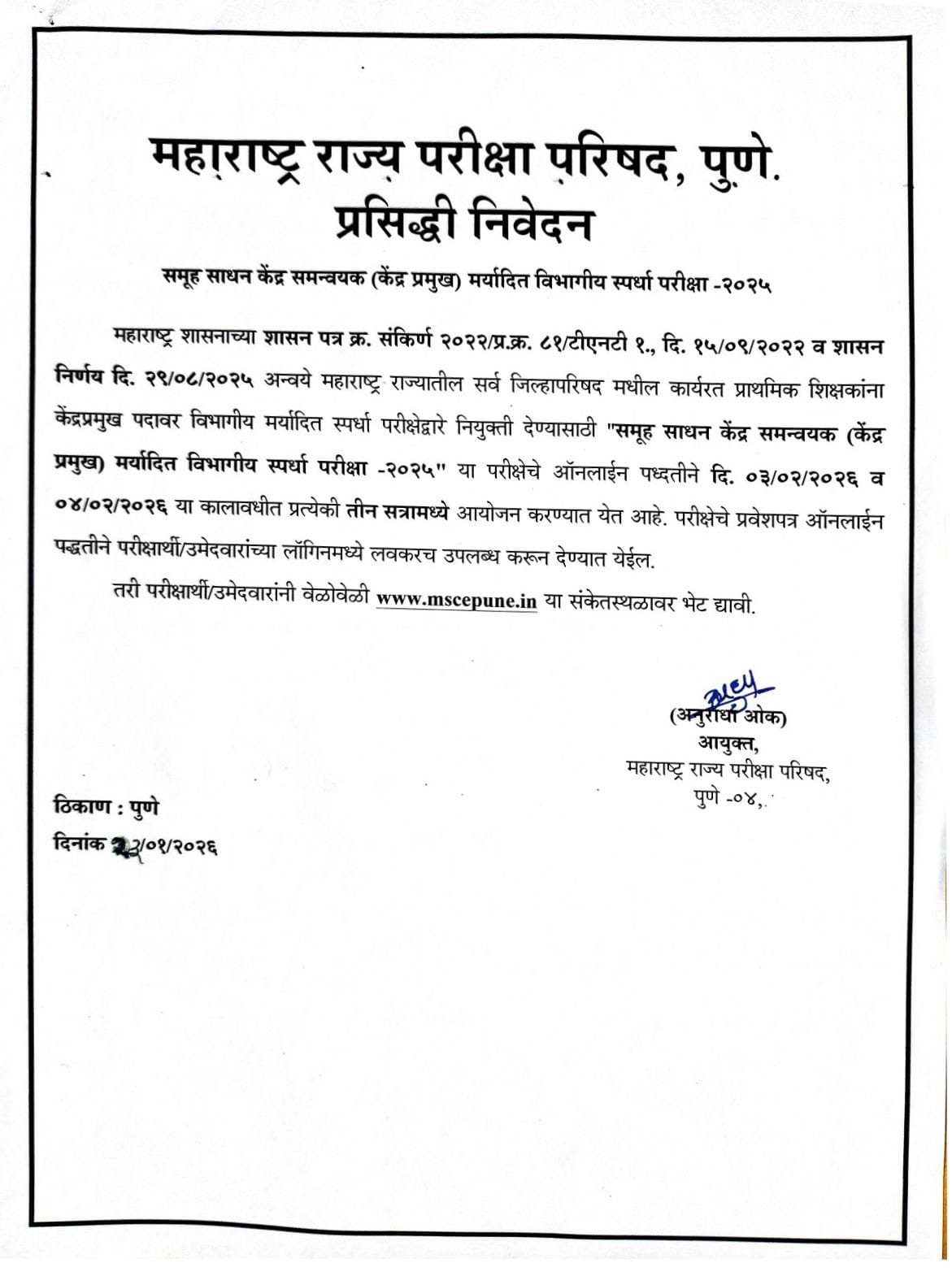 तरी परीक्षार्थी/उमेदवारांनी वेळोवेळी www.mscepune.in या संकेतस्थळावर भेट द्यावी.