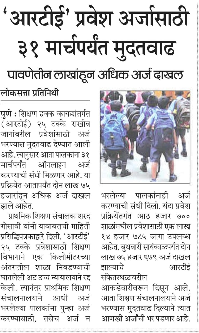 प्राथमिक शिक्षण संचालक शरद गोसावी यांनी याबाबतची माहिती प्रसिद्धिपत्रकाद्वारे दिली. ‘आरटीई’ 25 टक्के प्रवेशासाठी शिक्षण विभागाने एक किलोमीटरच्या अंतरातील शाळा निवडण्याची घातलेली अट उच्च न्यायालयाने रद्द केली. त्यानंतर प्राथमिक शिक्षण संचालनालयाने आधी अर्ज भरलेल्या पालकांना पुन्हा अर्ज करण्यासाठी, तसेच अर्ज न भरलेल्या पालकांनाही अर्ज करण्याची संधी दिली.